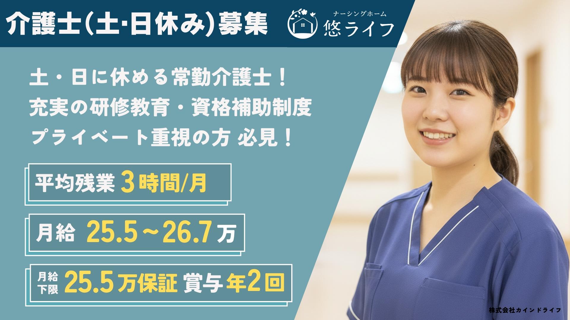【正社員】施設内の訪問介護士【大垣】 入社祝い金5万円!月平均残業3時間以下!ライフワークバランスの取れる職場です!給与:月給275,000円~292,000円賞与:年2回(夏季・冬季)昇給:年1回(人事評価制度あり)仕事内容住宅型有料老人ホームで、利用者様の生活全般に関わる援助をお願いします。 職種介護士 >介護士正社員 勤務地岐阜 >大垣 大垣 正社員 介護士 応 募 【正社員】施設内の訪問介護士 【梅林】 入社祝い金5万円!月平均残業3時間以下!ライフワークバランスの取れる職場です!給与:月給275,000円~292,000円賞与:年2回(夏季・冬季)昇給:年1回(人事評価制度あり)仕事内容住宅型有料老人ホーム「ナーシングホーム悠ライフ梅林」で、利用者様の生活全般に関わる援助をお願いします。 職種介護士 >介護士正社員 勤務地岐阜 >梅林 正社員 介護士 梅林 応 募 【正社員】施設内の訪問介護士【六条】 入社祝い金5万円!月平均残業3時間以下!ライフワークバランスの取れる職場です!給与:月給275,000円~292,000円賞与:年2回(夏季・冬季)昇給:年1回(人事評価制度あり)仕事内容住宅型有料老人ホーム「ナーシングホーム悠ライフ六条」で、利用者様の生活全般に関わる援助をお願いします。 職種介護士 >介護士正社員 勤務地岐阜 >六条 正社員 介護士 六条 応 募 【正社員】施設内の訪問介護士【草津】 入社祝い金5万円!月平均残業3時間以下!ライフワークバランスの取れる職場です!給与:月給275,000円~292,000円賞与:年2回(夏季・冬季)昇給:年1回(人事評価制度あり)仕事内容サービス付き高齢者向け住宅で、利用者様の生活全般に関わる援助をお願いします。 職種介護士 >介護士正社員 勤務地滋賀 >草津 正社員 草津 介護士 応 募 【正社員】施設内の訪問介護士【彦根】 入社祝い金5万円!月平均残業3時間以下!ライフワークバランスの取れる職場です!給与:月給275,000円~292,000円賞与:年2回(夏季・冬季)昇給:年1回(人事評価制度あり)仕事内容サービス付き高齢者向け住宅で、利用者様の生活全般に関わる援助をお願いします。 職種介護士 >介護士正社員 勤務地滋賀 >彦根 正社員 介護士 彦根 応 募 【正社員】施設内の訪問介護士【富山】 入社祝い金5万円!月平均残業3時間以下!ライフワークバランスの取れる職場です!給与:月給275,000円~292,000円賞与:年2回(夏季・冬季)昇給:年1回(人事評価制度あり)仕事内容住宅型有料老人ホームで、利用者様の生活全般に関わる援助をお願いします。 職種介護士 >介護士正社員 勤務地富山 >富山 正社員 介護士 富山 応 募 【正社員】施設内の訪問介護士【金沢】 入社祝い金5万円!月平均残業3時間以下!ライフワークバランスの取れる職場です!給与:月給275,000円~292,000円賞与:年2回(夏季・冬季)昇給:年1回(人事評価制度あり)仕事内容住宅型有料老人ホームで、利用者様の生活全般に関わる援助をお願いします。 職種介護士 >介護士正社員 勤務地石川 >金沢 正社員 介護士 金沢 応 募 【正社員】施設内の訪問介護士【新潟】 入社祝い金5万円!月平均残業3時間以下!ライフワークバランスの取れる職場です!給与:月給275,000円~292,000円賞与:年2回(夏季・冬季)昇給:年1回(人事評価制度あり)仕事内容サービス付き高齢者向け住宅で、利用者様の生活全般に関わる援助をお願いします。 職種介護士 >介護士正社員 勤務地新潟 >新潟 正社員 介護士 新潟 応 募 【正社員】施設内の訪問介護士 【津新町】 入社祝い金5万円!月平均残業3時間以下!ライフワークバランスの取れる職場です!給与:月給275,000円~292,000円賞与:年2回(夏季・冬季)昇給:年1回(人事評価制度あり)仕事内容サービス付き高齢者向け住宅で、利用者様の生活全般に関わる援助をお願いします。 職種介護士 >介護士正社員 勤務地三重 >津新町 正社員 介護士 津新町 応 募 【正社員】施設内中心の看護主任【津新町】 入社祝い金5万円!月平均残業5時間以下!ライフワークバランスの取れる職場です!給与:月給359,000円~374,000円賞与:年2回(夏季・冬季)昇給:年1回(人事評価制度あり)仕事内容住宅型有料老人ホームで利用者様の生活全般に関わる援助と、スタッフの育成をお任せします。 職種看護職 >看護師主任 勤務地三重 >津新町 正社員 津新町 看護主任 応 募 【正社員】施設内中心の訪問看護主任【草津】 入社祝い金5万円!月平均残業5時間以下!ライフワークバランスの取れる職場です!給与:月給359,000円~374,000円賞与:年2回(夏季・冬季)昇給:年1回(人事評価制度あり)仕事内容サービス付き高齢者向け住宅『ナーシングホーム悠ライフ草津』の看護主任として、利用者様の生活全般に関わる援助と、スタッフの育成をお任せします。 職種看護職 >看護師主任 勤務地滋賀 >草津 正社員 草津 看護主任 応 募 【正社員】施設内中心の訪問看護主任 【新潟】 入社祝い金5万円!月平均残業5時間以下!ライフワークバランスの取れる職場です!給与:月給359,000円 〜 374,000円賞与:年2回(夏季・冬季)昇給:年1回(人事評価制度あり)仕事内容サービス付き高齢者向け住宅『ナーシングホーム悠ライフ新潟』の看護主任として、利用者様の生